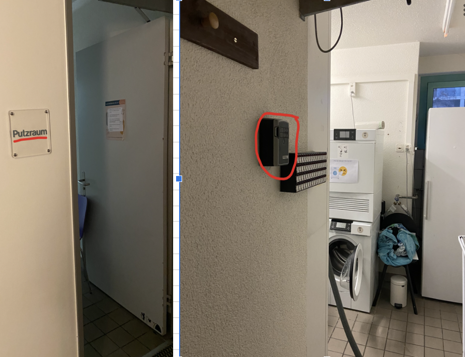 The emergency SALTO-Case can be found in the first floor's laundry room, on the shelf next to the washing machine